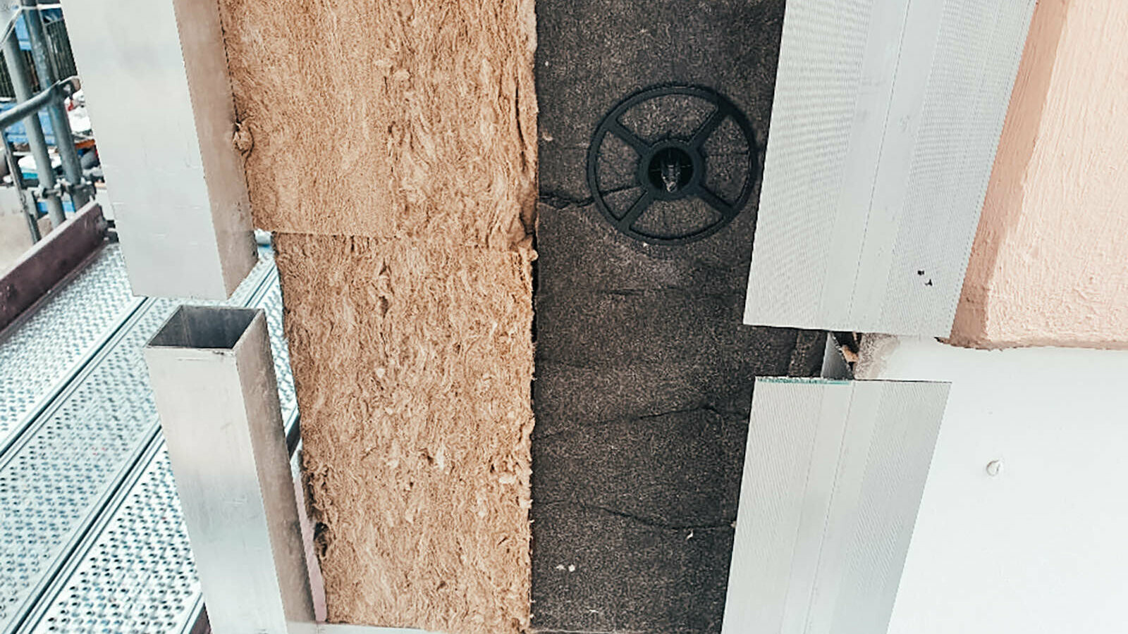 Comme mesure de protection contre l’incendie, une barrière coupe-feu en laine de roche, fixée avec des plaques isolantes en matériau synthétique, a été installée tous les deux étages. En cas d’incendie, les fixations incombustibles fondent, la laine de roche tombe dans la direction des Sidings, empêchant ainsi les flammes et la fumée de se propager aux étages supérieurs.