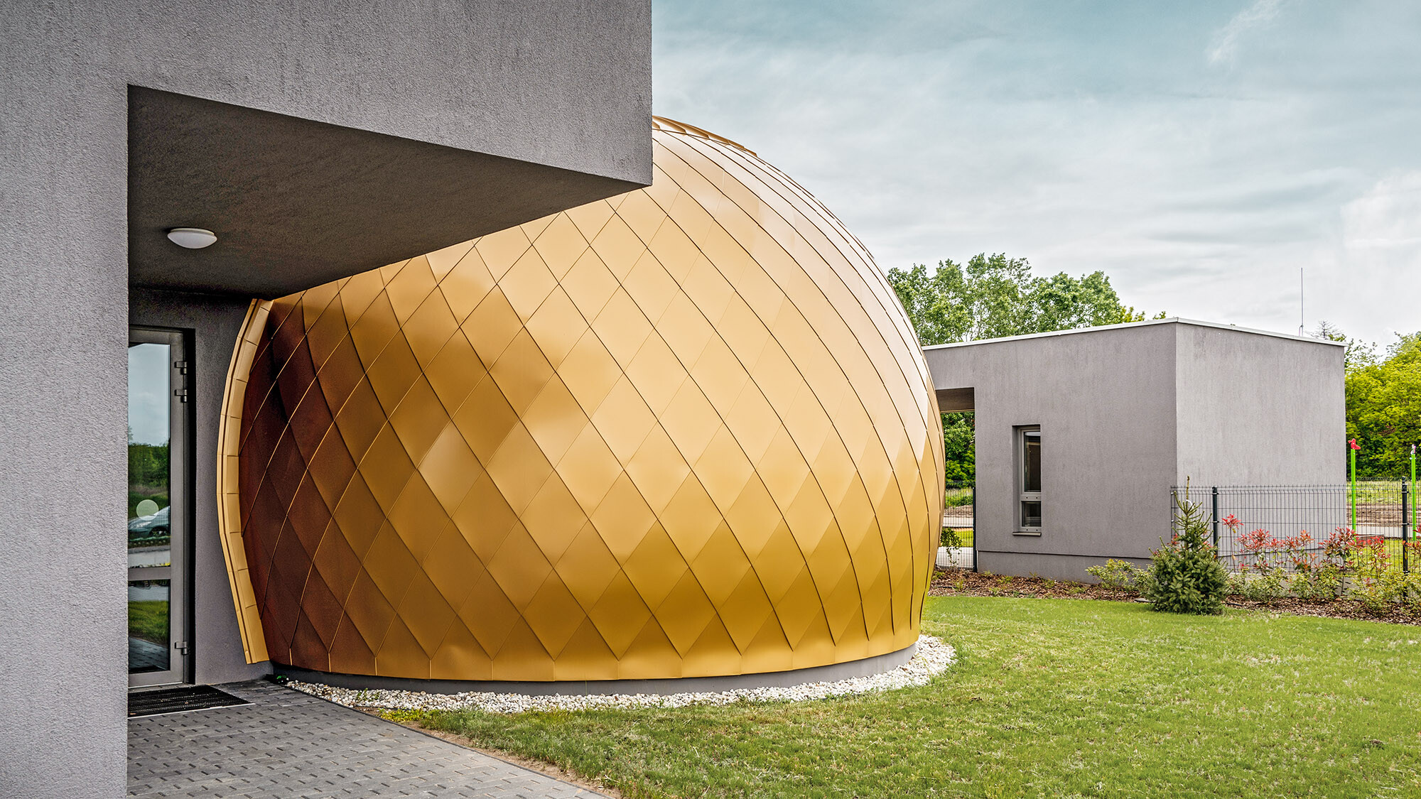 Les « sphères dorées » de la nouvelle crèche dans la ville hongroise de Székesfehérvár sont sur toutes les lèvres de par leur construction unique en son genre qui saute aux yeux. Avec quelles fonctions complètent-elles l’offre de la crèche dans le quartier en pleine expansion de Maroshegy ? Voyons ce qui se trouve derrière leurs losanges PREFA scintillants avec leur créateur László Erdei.