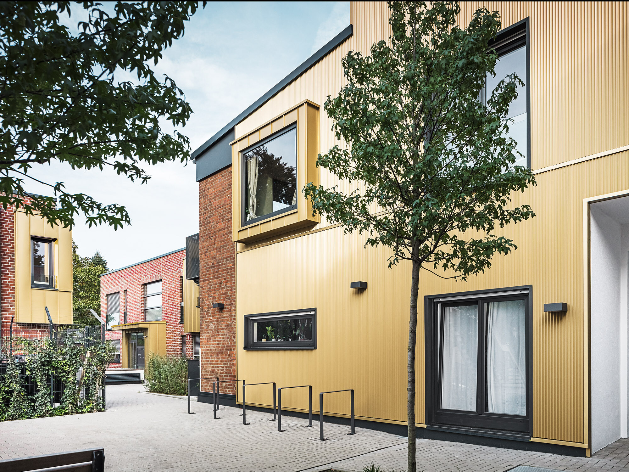Avec 23 appartements locatifs de qualité et une unité commerciale, les architectes de Rotterdam Dakowski apportent de l'harmonie dans les anciens murs de l'usine Kellerhöfe à Langenfeld. Leur ensemble a été complété par de l'aluminium mayagold de PREFA, avec lequel ils ont posé des accents clairs sur la façade.