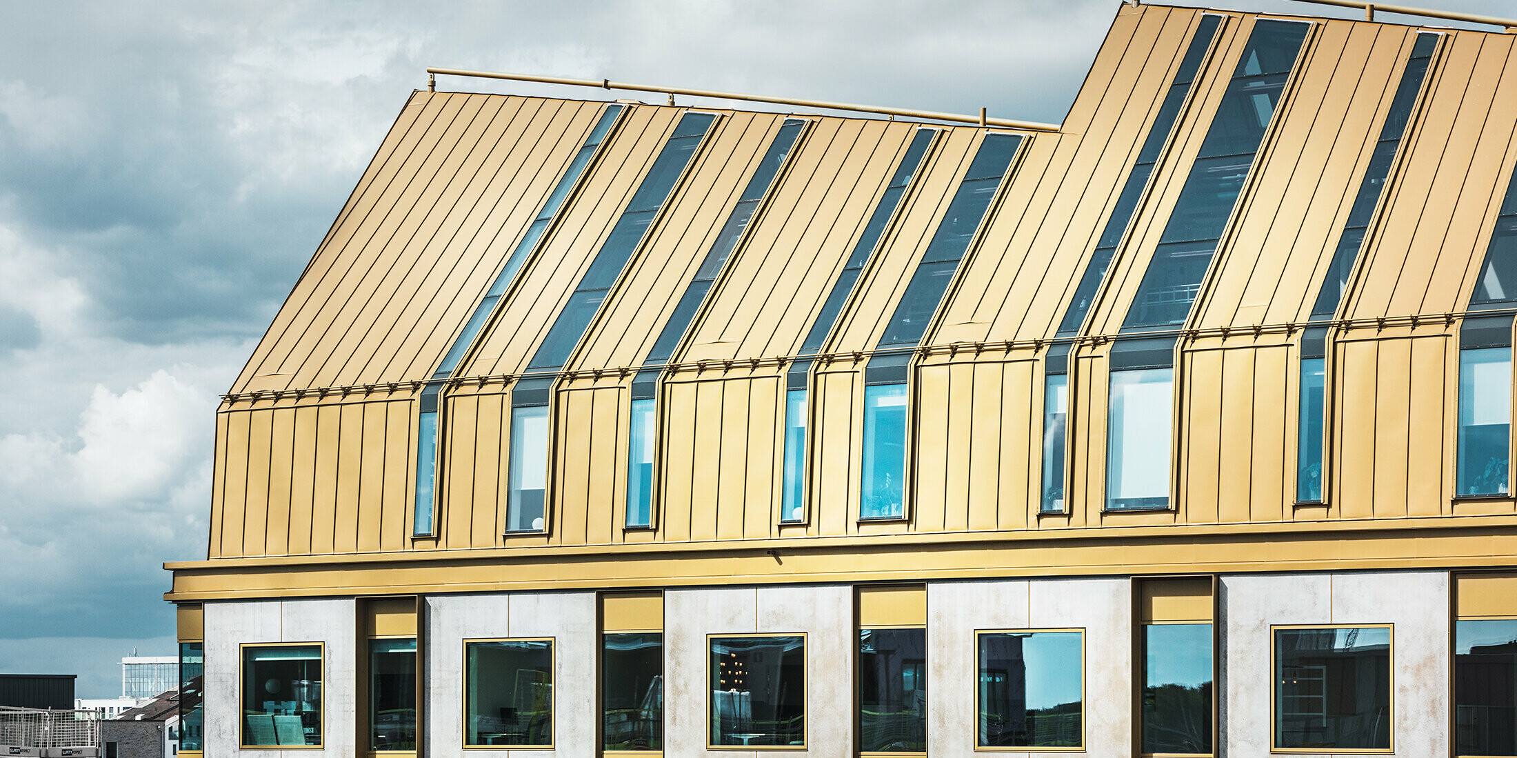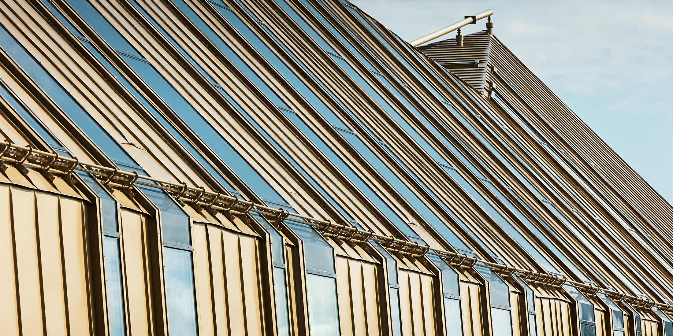 L’ossature porteuse en acier de la toiture est recouverte de 2 000 m² d’éléments PREFALZ dont le revêtement est une fabrication spéciale signée PREFA. La couleur spéciale élaborée pour ce projet s’appelle Or Jaisalmer, du nom de la ville indienne du désert dont la réputation de ville dorée a servi de modèle à la couleur chatoyante du revêtement.