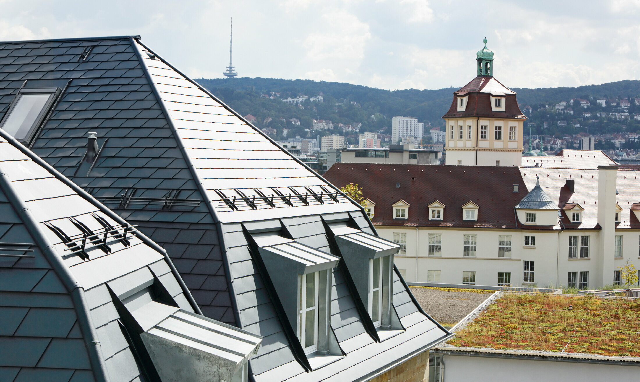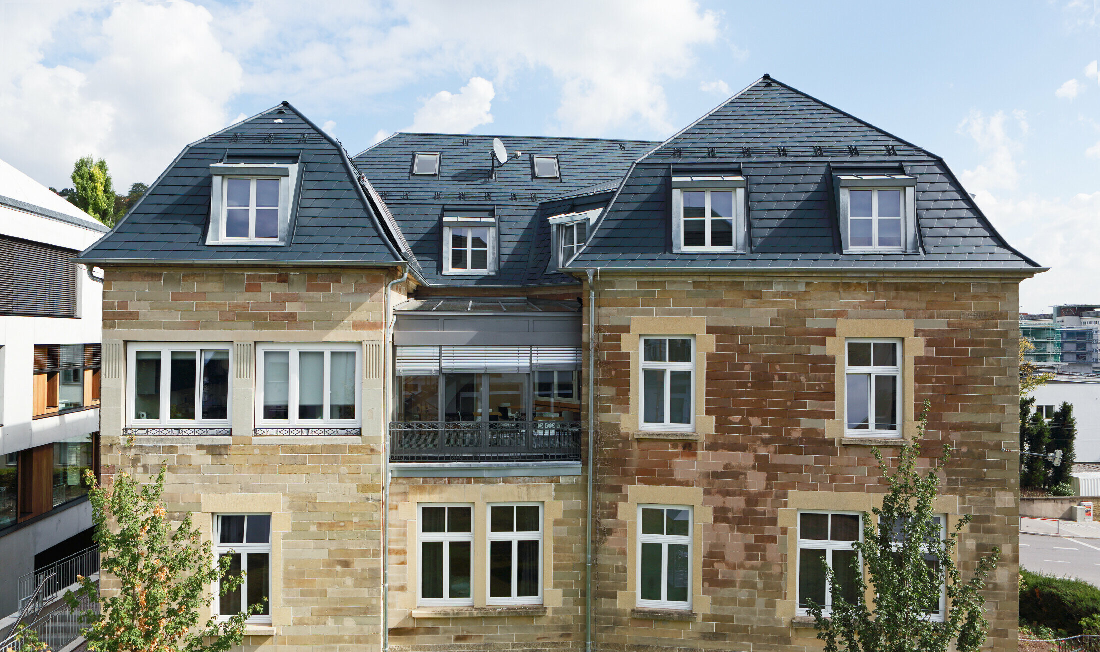 Maison bleue à Stuttgart avec le bardeau PREFA et PREFALZ couleur anthracite P.10