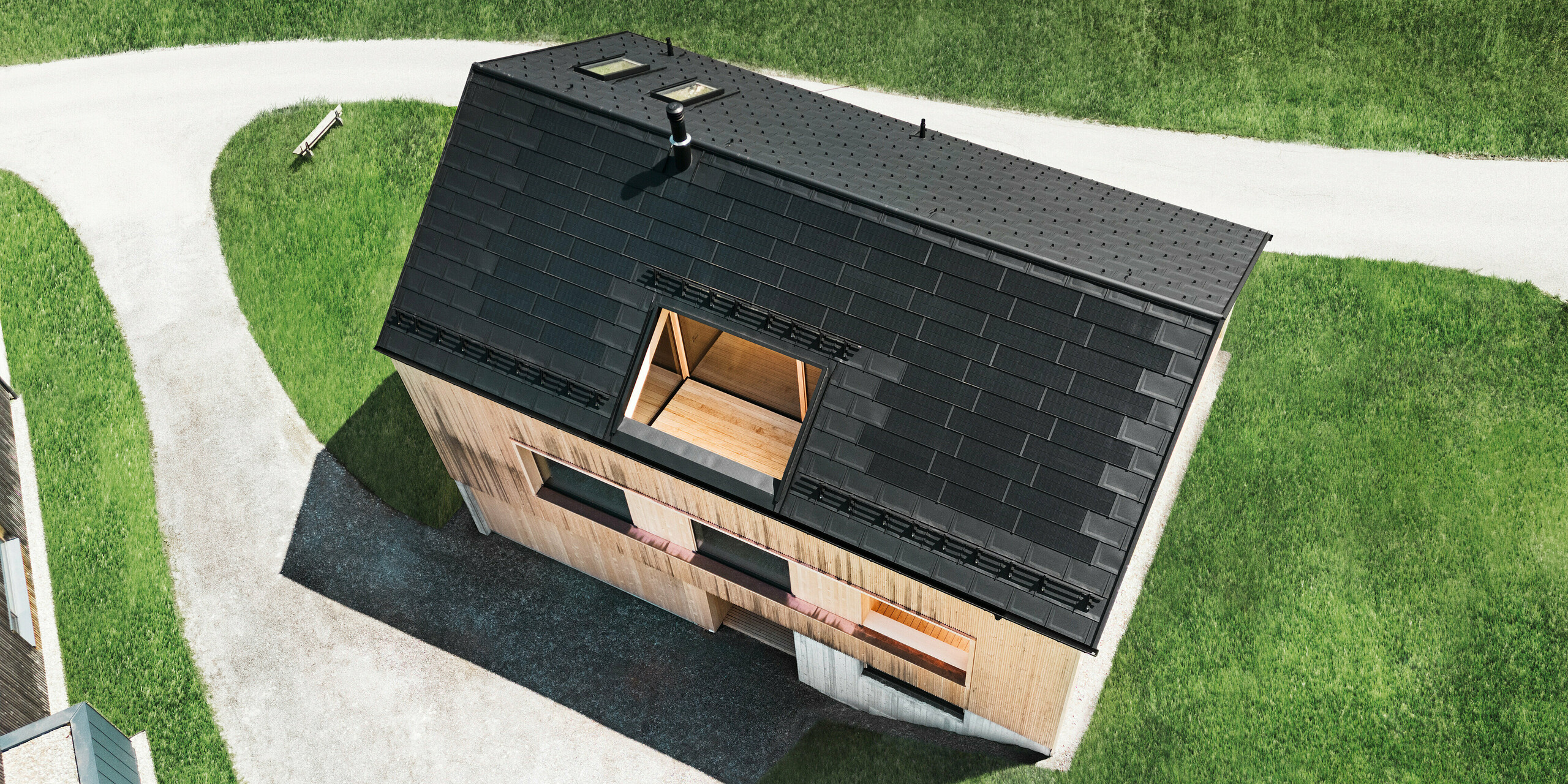 Les produits en aluminium noir de PREFA sont conçus de manière uniforme avec la surface P.10 résistante aux couleurs. L'aluminium foncé offre un contraste impressionnant avec la façade en bois clair et l'environnement naturel.