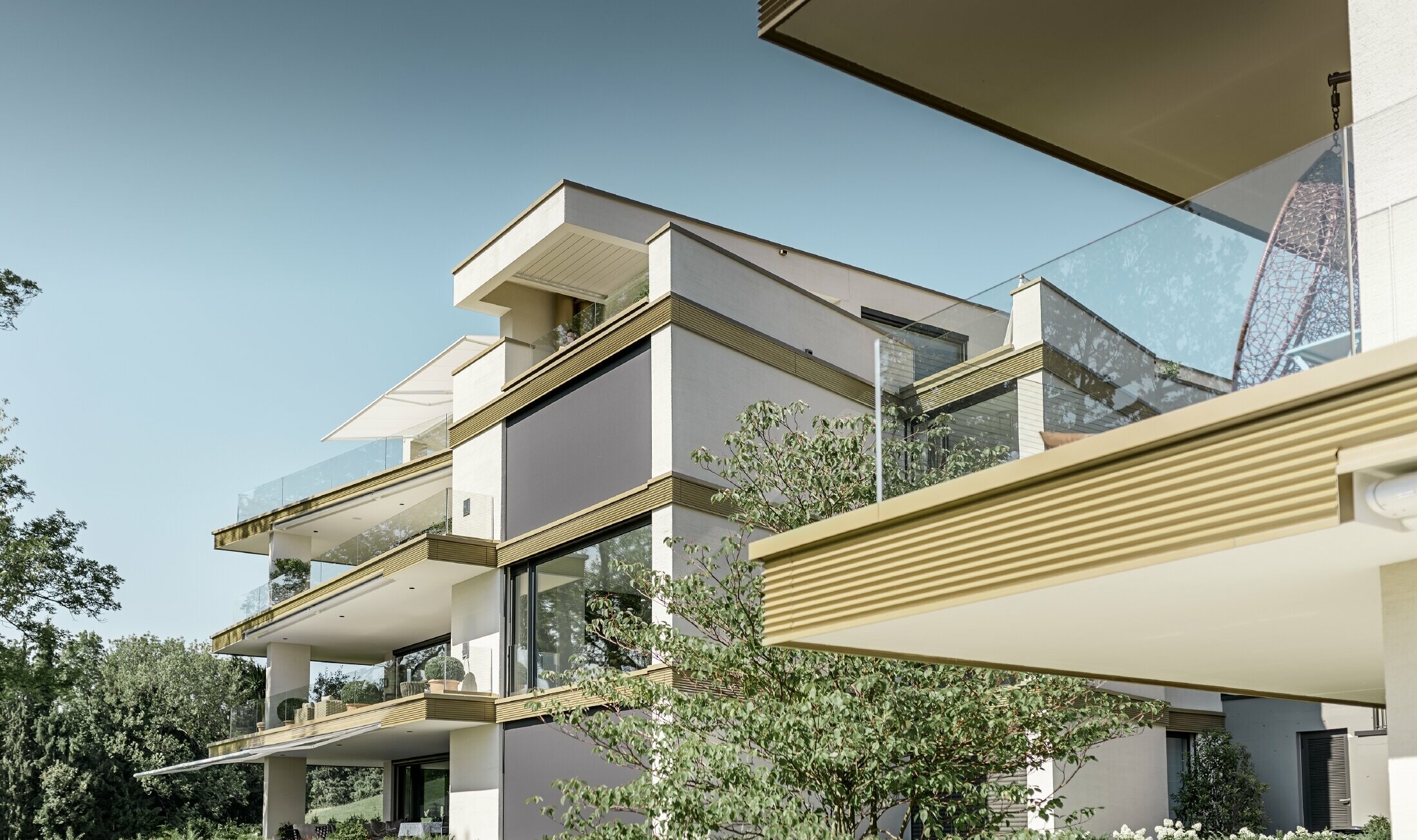 Sur cet immeuble d’habitation en Suisse, la séparation d’étage et l’entrée ont été habillées avec le profil triangle PREFA.