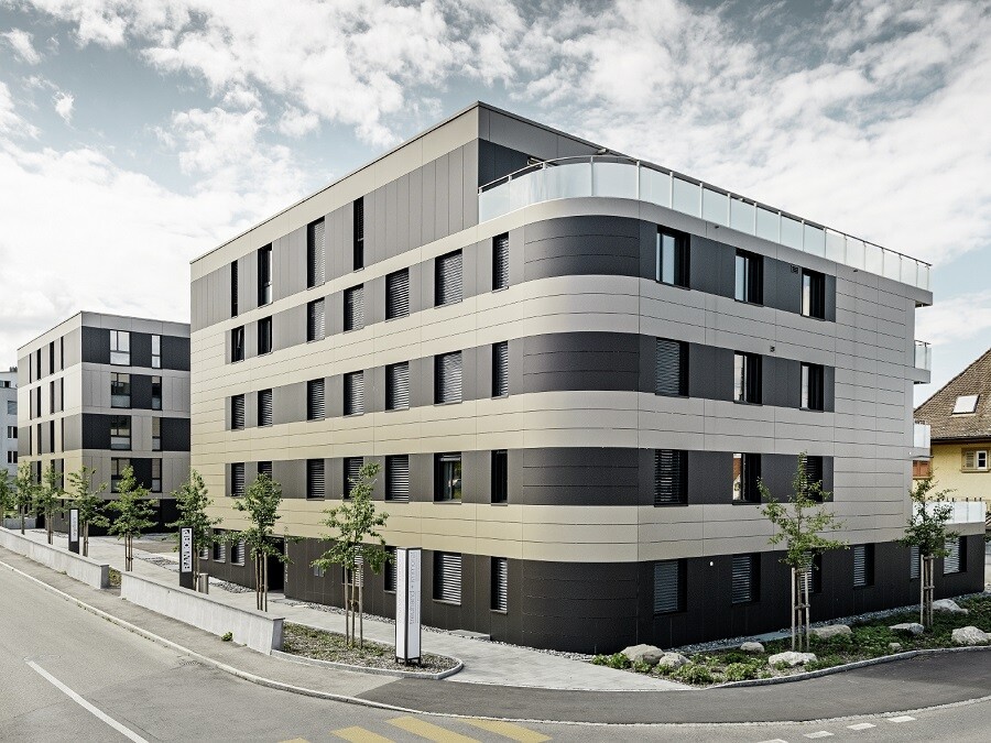 Bâtiment d’entreprise aux angles extérieurs arrondis, revêtu du panneau composite en aluminium PREFA, couleur bronze et gris noir.