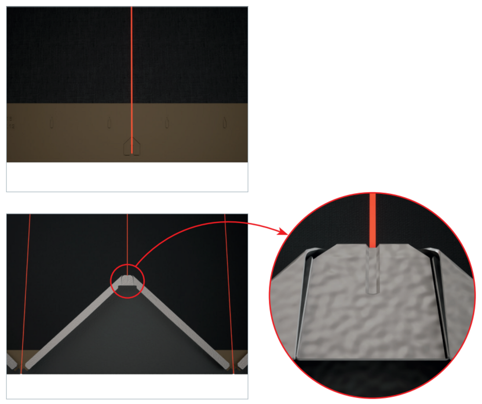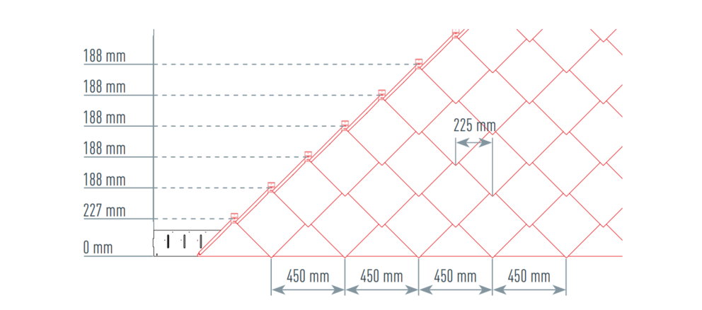Pour faciliter la pose des losanges de façade PREFA 29 x 29, il est recommandé de réaliser une trame de marques de cordeau verticales espacées de 450 mm (s’aider des repères dans la bande de départ). Pour respecter précisément la cote de traçage dans chaque rangée, on peut également, si nécessaire, marquer et vérifier la moitié de la cote de traçage à intervalles réguliers. Alignez les demi-losanges de départ en fonction des encoches (sur le bord supérieur des demi-losanges de départ) avec les marques de cordeau verticales (voir figure ci-dessous). Lors de cette opération, veillez à ce que la zone pour le rebord latéral (p. ex. extrémité latérale ou angles de bâtiments) ne corresponde pas au centre des losanges de façade 29 x 29 (respecter la symétrie de la surface de la façade).