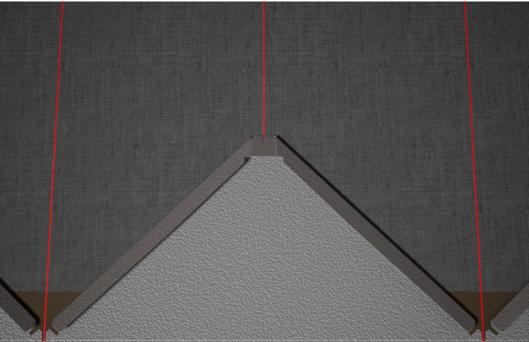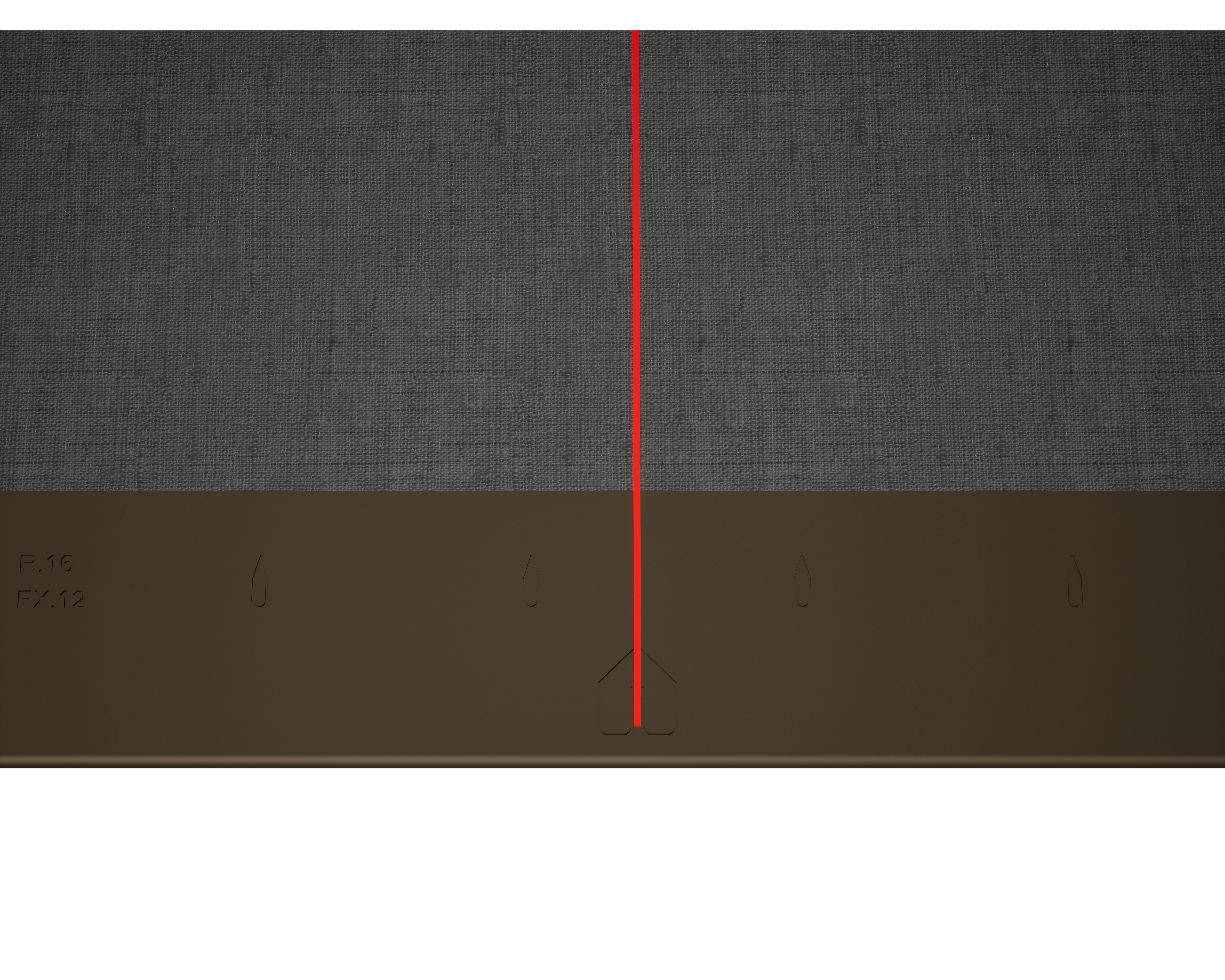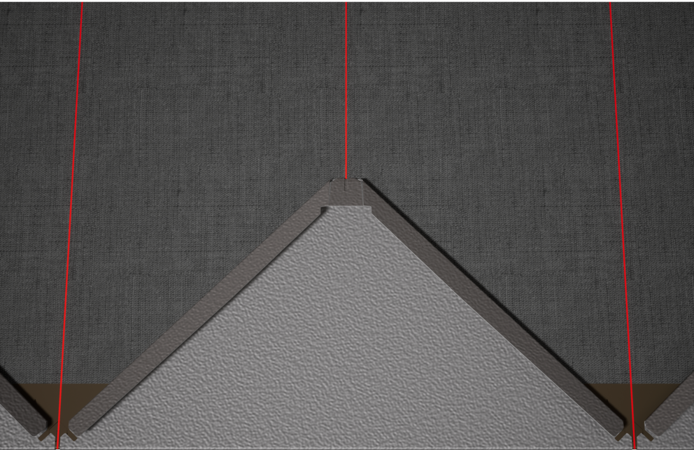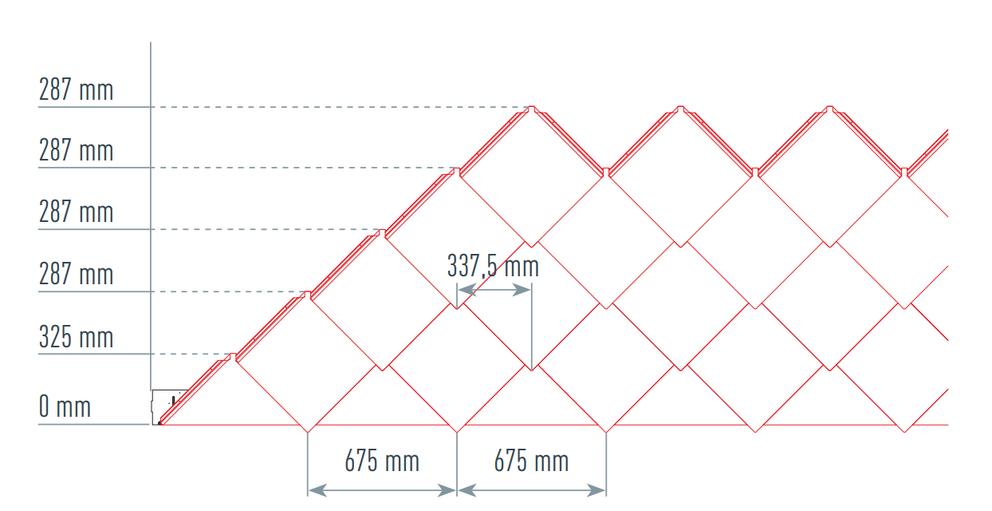 Pour faciliter la pose des losanges de façade PREFA 44 x 44, il est recommandé de réaliser une trame de marques de cordeau verticales espacées de 675 mm (s’aider des repères dans la bande de départ). Pour respecter précisément la cote de traçage dans chaque rangée, on peut également, si nécessaire, marquer et vérifier la moitié de la cote de traçage à intervalles réguliers. Alignez les demi-losanges de départ en fonction des encoches (sur le bord supérieur des demi-losanges de départ) avec les marques de cordeau verticales (voir figure ci-dessous). Lors de cette opération, veillez à ce que la zone pour le rebord latéral (p. ex. extrémité latérale ou angles de bâtiments) ne corresponde pas au centre des losanges de façade 44 x 44 (respecter la symétrie de la surface de la façade).