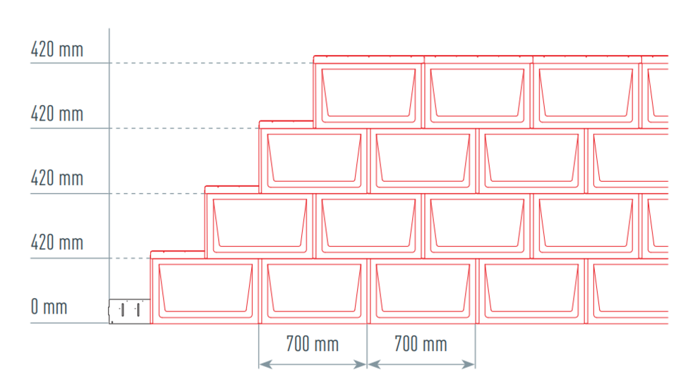 Traçage vertical : 700 mm (chaque deuxième rangée décalée de 350 mm)