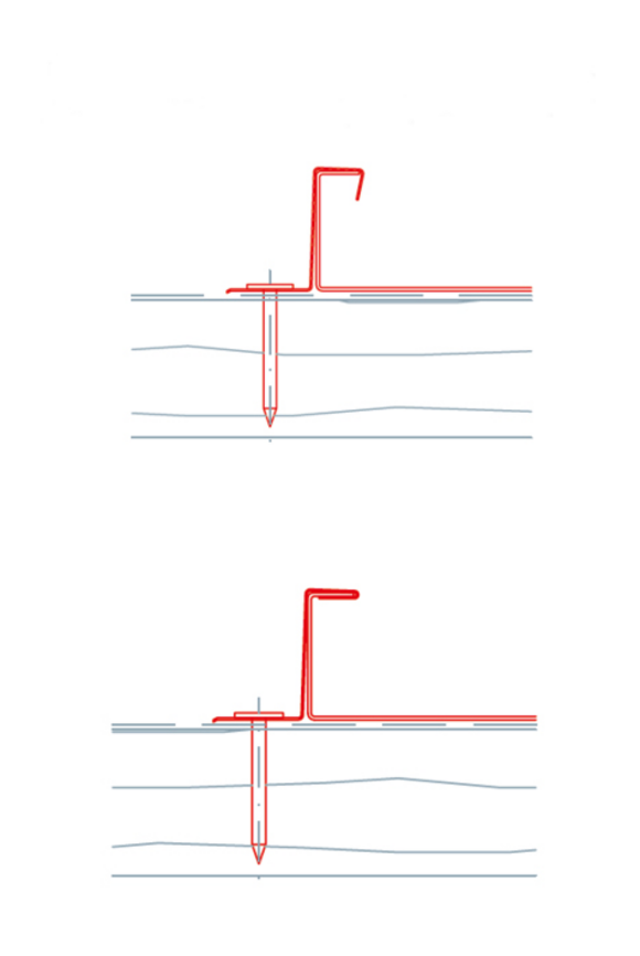 Lors de la fixation des pattes fixes et des pattes coulissantes PREFA Niro, il convient de veiller à enfoncer suffisamment les clous annelés de fixation et à ne pas les laisser dépasser au-dessus de la moulure, afin de ne pas créer de points de pression et de frottement dans la couverture posée. La fixation des pattes fixes PREFA requiert 2 clous annelés PREFA Niro. La fixation des pattes coulissantes PREFA requiert 3 clous annelés PREFA Niro.