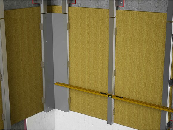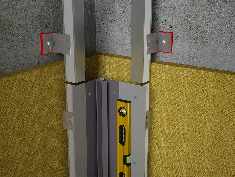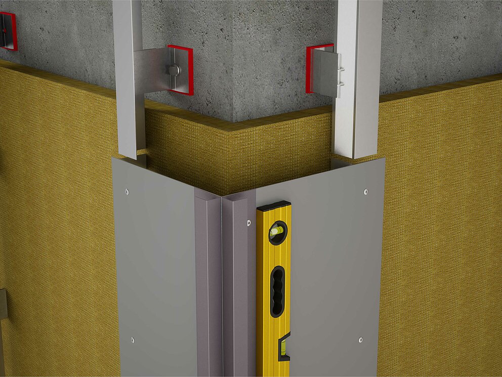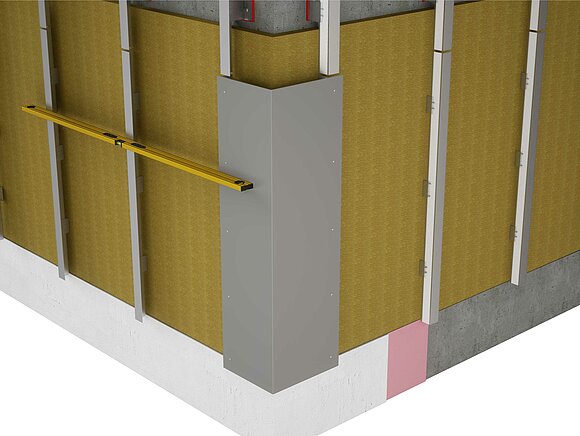 En vue du montage de l’angle sortant ou rentrant, préparez la sous-construction pour une pose des profils à l’horizontale. Pour monter les profils d’angle rentrants ou sortants, commencez par relier la sous-construction verticale à une équerre de renfort de bordure en tôle d’aluminium de 2 mm d’épaisseur ou en tôle d’acier galvanisé de 1 mm. Lors du montage de la sous-construction, veillez à positionner les profils porteurs plus vers l’intérieur en tenant compte de l’épaisseur de l’équerre de renfort de bordure, afin de garantir la planéité de la sous-construction.