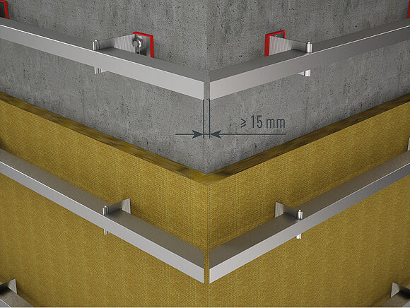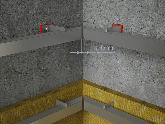 Lors du montage de profils d’angle rentrants ou sortants, veillez à ce que les profils porteurs de la sous-construction ne se rejoignent pas dans les coins. Gardez un écart d’au moins 15 mm. Au moment de la fixation, il faut tenir compte de la dilatation en définissant clairement les points fixes et les points coulissants.