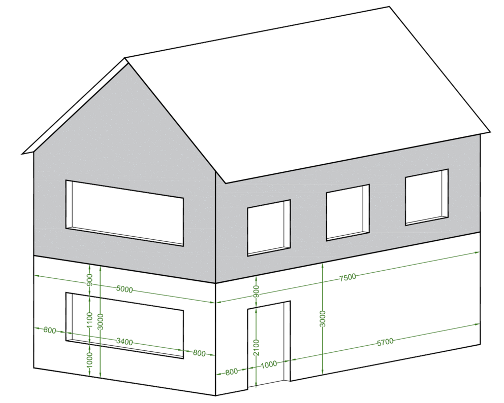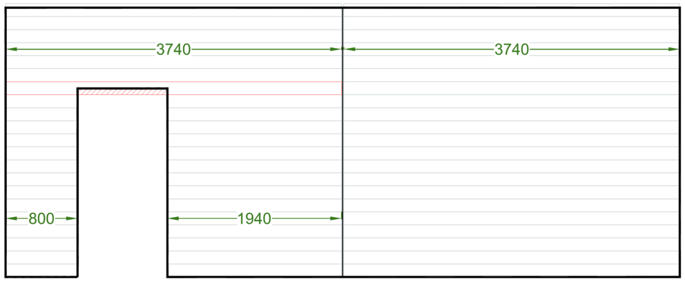 Les découpes qui empiètent partiellement sur un profil, telles que les fenêtres et les portes, ne doivent pas être prises en compte dans la détermination des quantités de matériau nécessaires et doivent être adaptées sur site (surface délimitée en rouge).