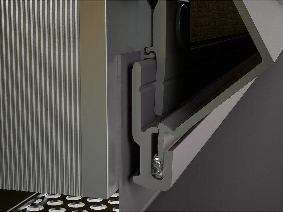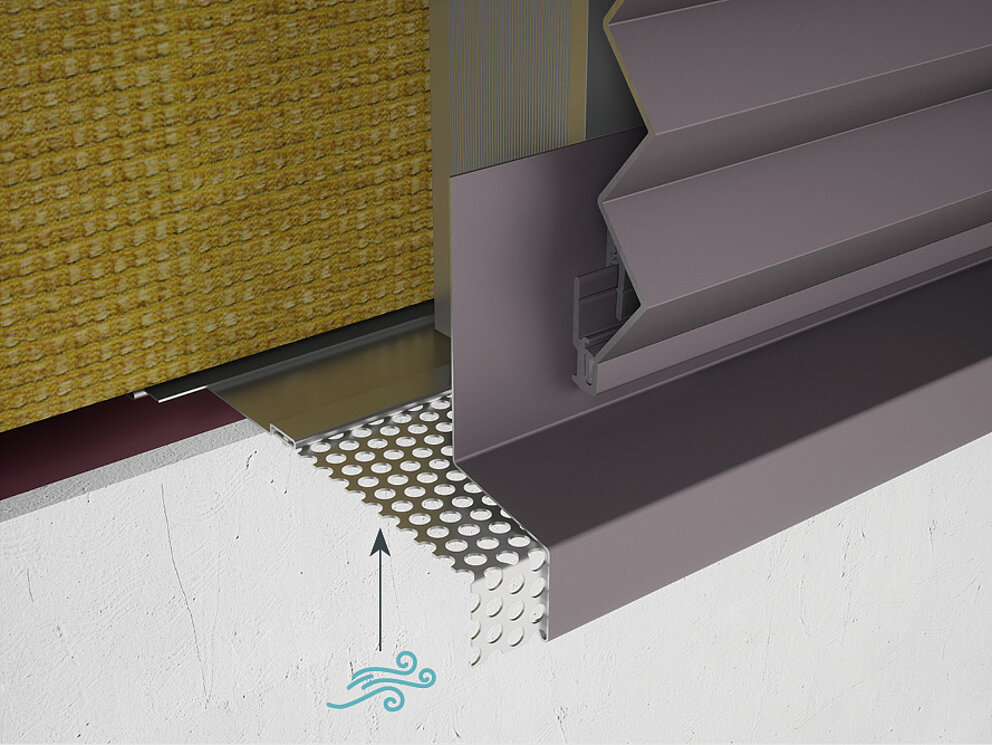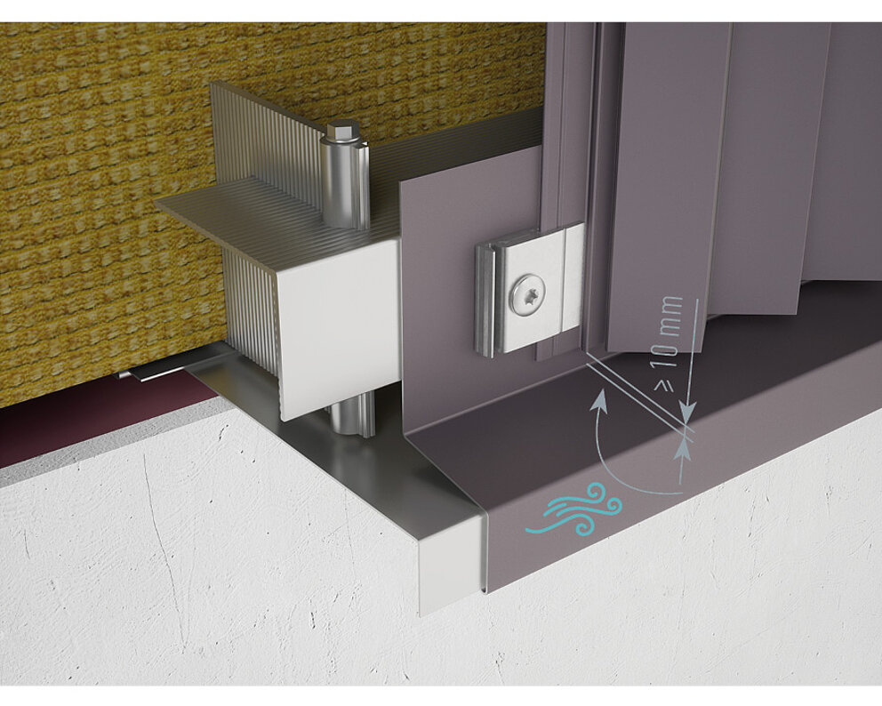 Afin d’assurer une entrée d’air suffisante dans la lame d’air ventilée des profils extrudés, un écart d’au moins 10 mm doit être maintenu entre le bord inférieur du profil et le renvoi d’eau.