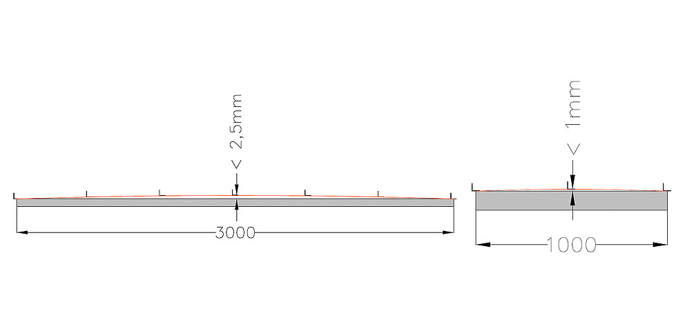 La tolérance par rapport à la sous-construction doit être limitée à une cote de 2,5 mm en cas d’espacement des points de mesure de 3 000 mm ou de 1 mm en cas d’espacement de 1 000 mm.