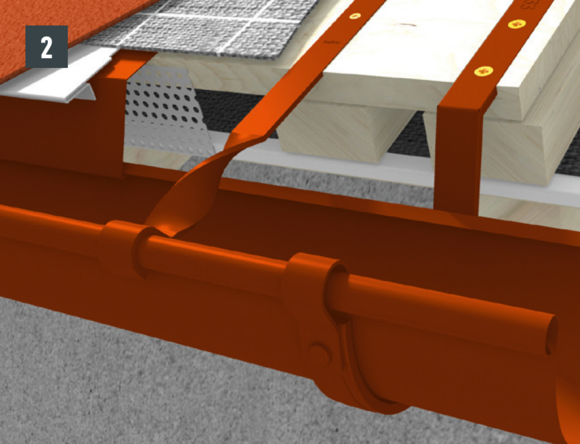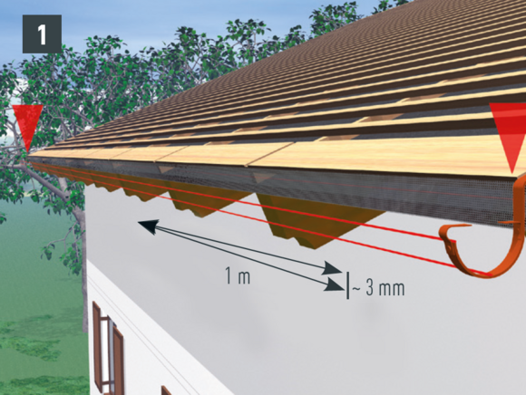 • Montez la gouttière avec une pente (environ 3 mm par mètre), fixez les crochets de gouttière de la façon habituelle, à l’écart des chevrons (Fig. 1).