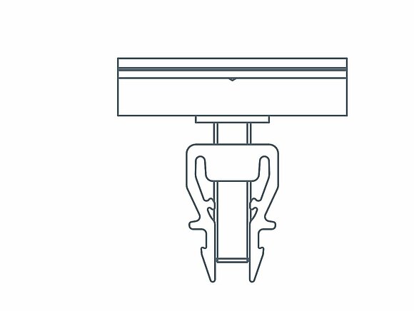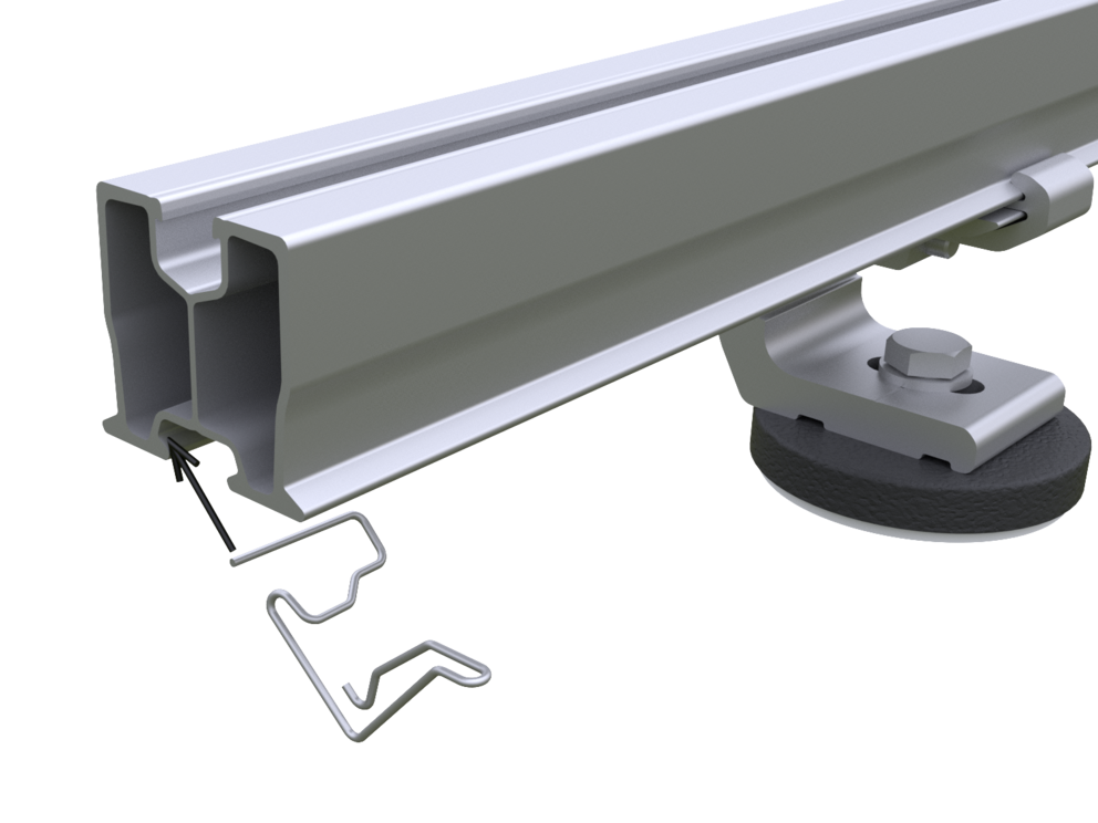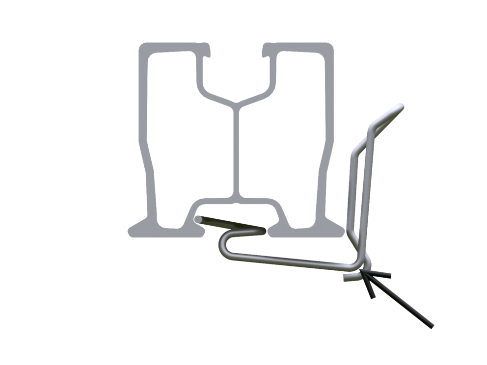 Le clip de passage de câbles est fixé en oblique par le bas à la rainure du rail et agrafé dans le rail à l’aide d’une pression inclinée vers le haut.