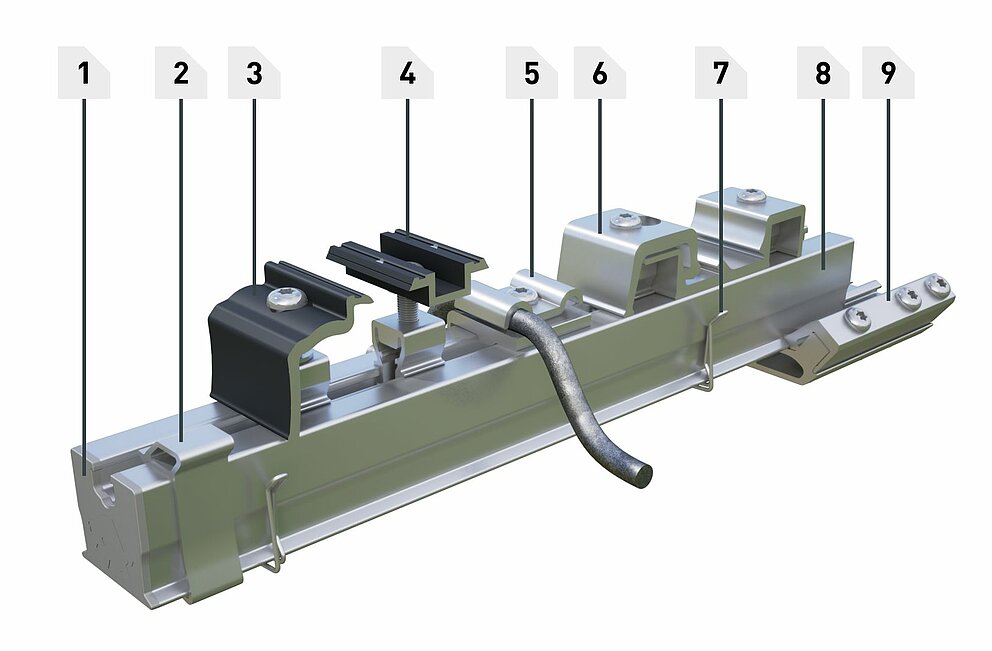 Afin d’éviter les chutes de modules photovoltaïques, les accessoires pour panneaux solaires PREVARIO utilise des vis de sécurité pour module. Dans la série de modules la plus basse d’une surface de générateur, deux vis de sécurité par module sont fixés sur le rail du module supérieur. Ainsi, si un module glisse, l’arête supérieure de son cadre restera accrochée à la vis de sécurité. Un module qui a glissé et est retenu par les vis de sécurité doit impérativement être remplacé. Les modules concernés doivent être réinstallés immédiatement.