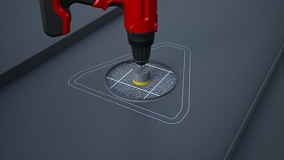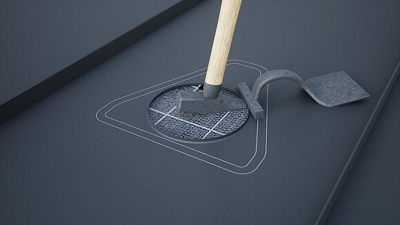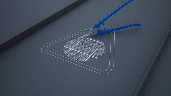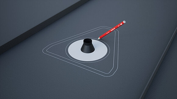 Positionner la chatière pour panneaux solaires et marquer le contour. Marquer ensuite la surface de collage (25 mm) et le contour du manchon de tuyau. Découpe et sertissage de la zone circulaire.