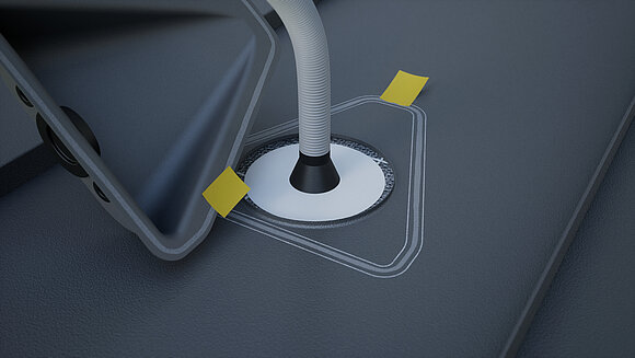 Appliquez de la colle spéciale tout autour et guidez le tuyau ondulé à travers le bec. Posez ensuite la chatière pour panneaux solaires et pressez-le au centre.