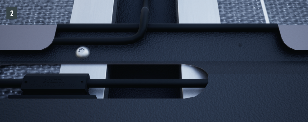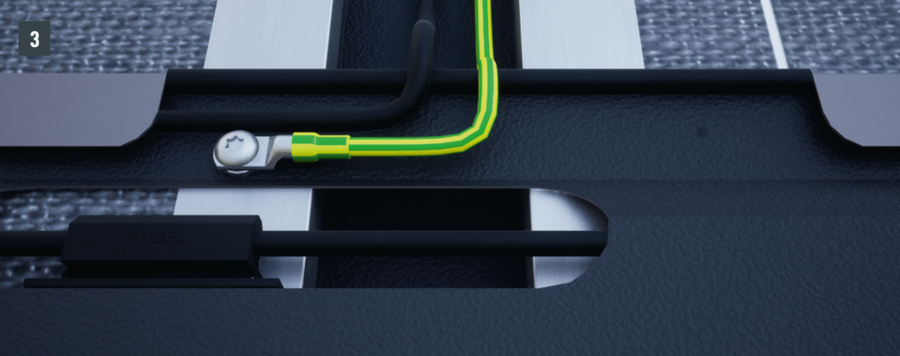 Les tuiles solaires recouvrant le canal de câble doivent être, en plus, vissées avec une vis à tête bombée (voir Fig. 2). Le canal de câble doit donc être constituée d’une pièce de bordure en aluminium, afin de créer une liaison conductrice verticale supplémentaire entre les tuiles solaires.