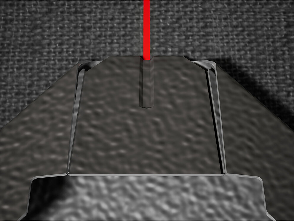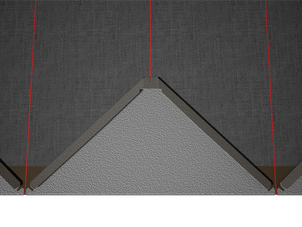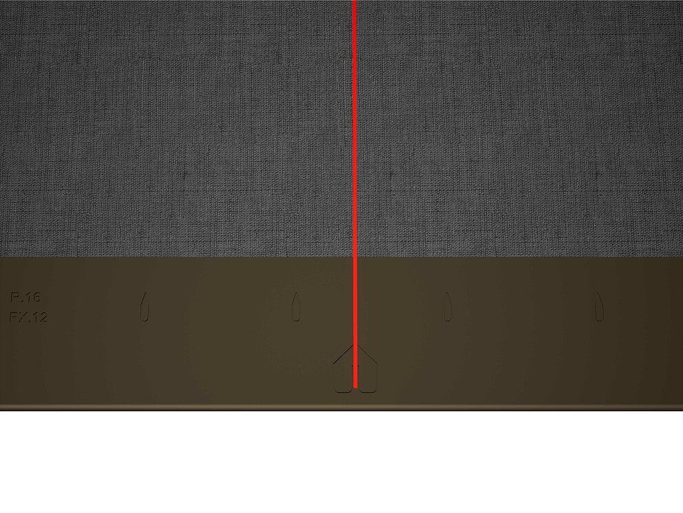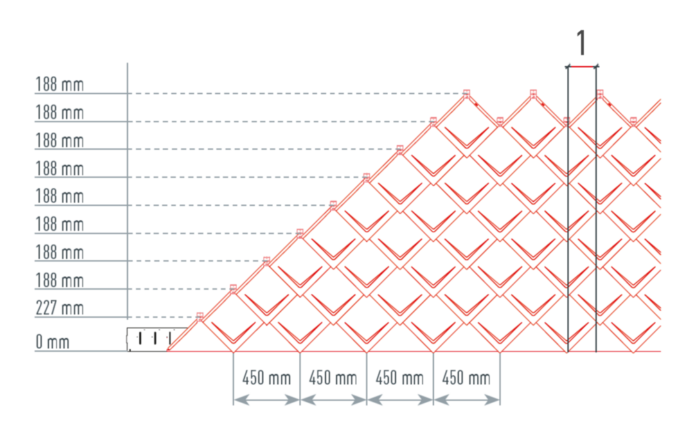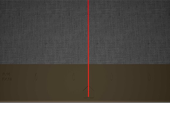 Pour faciliter la pose des losanges de toiture PREFA 29 × 29, il est recommandé de réaliser une trame de marques de cordeau verticales espacées de 450 mm (s'aider des repères dans la bande de départ). Pour respecter précisément la cote de traçage dans chaque rangée, on peut si nécessaire marquer aussi la moitié de la cote de traçage et la vérifier à intervalles réguliers. Alignez les demi-losanges de départ en fonction des encoches (sur le bord supérieur des demi-losanges de départ) avec les marques de cordeau verticales (voir figure ci-dessous). Lors de cette opération, veillez à ce que la zone pour le rebord latéral (par ex. pour la réalisation de la rive) ne corresponde pas au centre des losanges de toiture 29 × 29 (respecter la symétrie / milieu du toit).