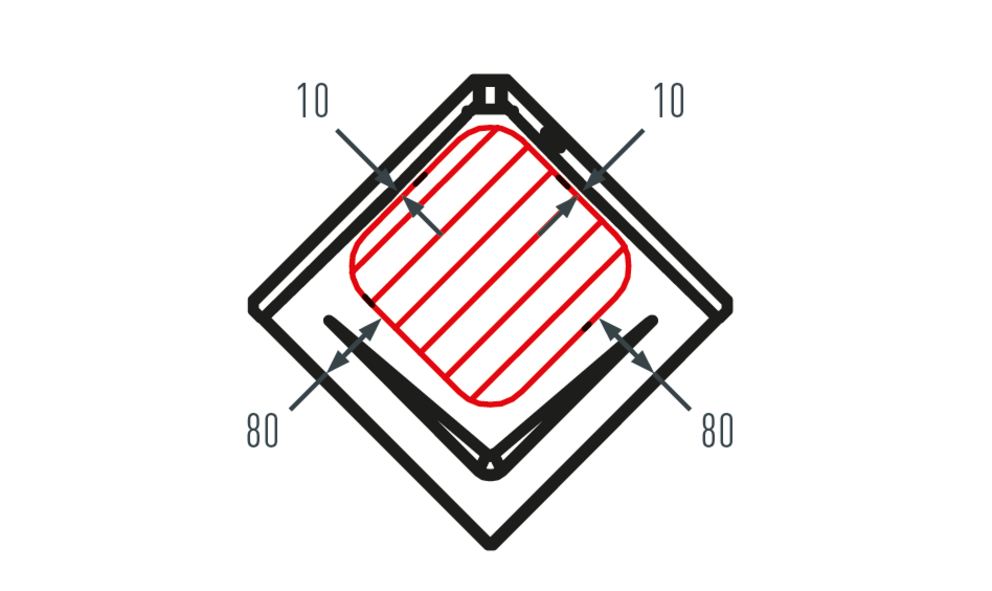 Lors du montage des accessoires de toiture, tenez compte de la zone de montage autorisée sur les losanges de toiture 29 × 29. La figure ci-dessous montre la zone de montage pour les accessoires sur platines. Pour les autres accessoires, des zones de montage différentes peuvent être définies.