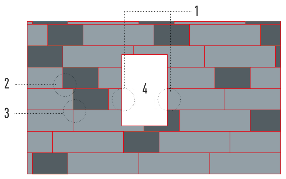 Un panneau FX.12 découpé a été réutilisé de l'autre côté (4) de l’ouverture (1) La répartition des joints n’est donc plus correcte (2) et peut, dans le pire des cas, conduire à un chevauchement (3). Pour éviter cela, des exemples de pose ont été créés afin d’obtenir un décalage optimal des joints.