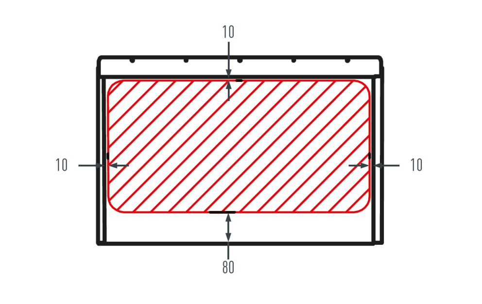 Lors du montage des accessoires de toiture, tenez compte de la zone de montage autorisée sur les panneau de toiture FX.12. La figure ci-dessous montre la zone de montage pour les accessoires sur platines. Pour les autres accessoires, des zones de montage différentes peuvent être définies.