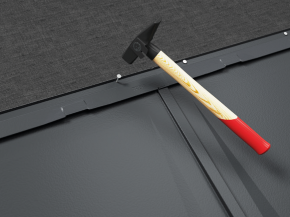 Fixez les R.16 avec les clous annelés 2,8/25 fournis (fixation de base 3 pièces par tuile R.16). Pour les couvertures PREFA posées sur plusieurs couches bitumineuses (par ex. bandes en bitume), vous devrez utiliser des clous annelés plus longs (par ex. 2,8/40). Veuillez l’indiquer séparément lors de la commande.