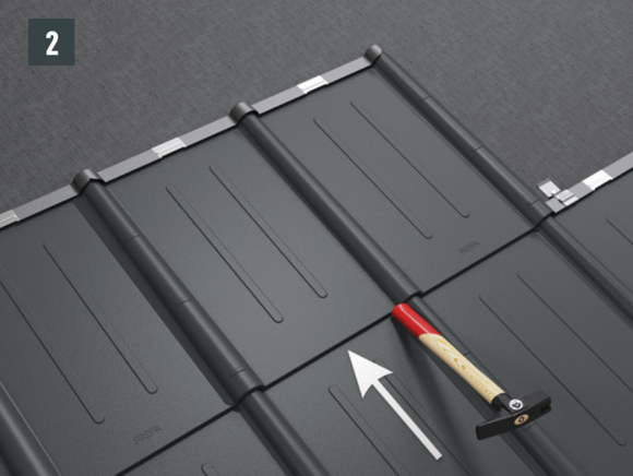 Agrafez la tuile dans la pince de celle du rang inférieur. Tapotez légèrement le bord inférieur de la tuile avec le manche du marteau.