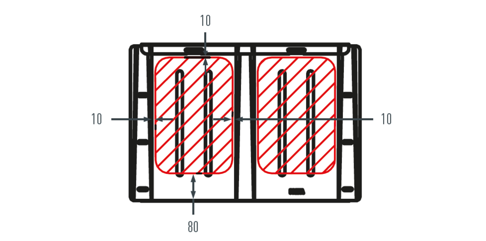 Lors du montage des accessoires de toiture, tenez compte de la zone de montage autorisée sur les tuiles. La figure ci-dessous montre la zone de montage pour les accessoires sur platines. Pour les autres accessoires, des zones de montage différentes peuvent être définies.
