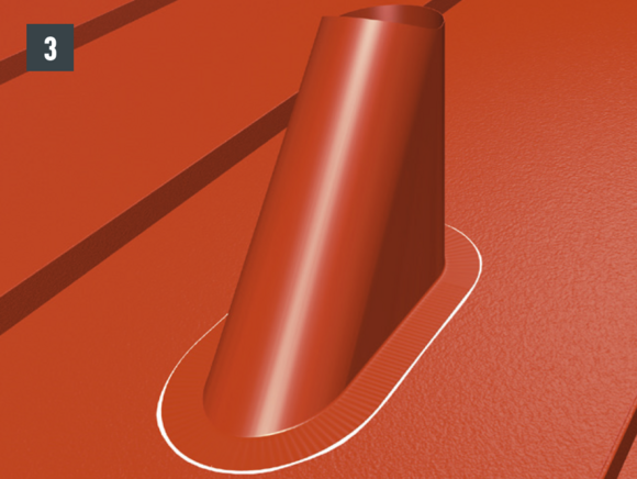 Poser le raccordement de ventilation à coller PREFA sur le passage de tube, puis marquer sur la bande PREFALZ le pourtour ovale, intérieur et extérieur de la bride de collage.
