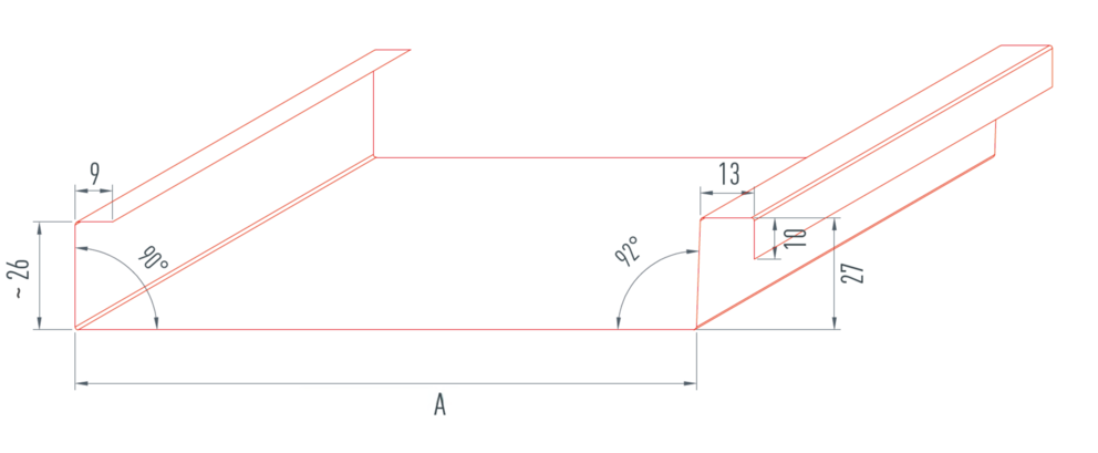 Les angles et dimensions à respecter du profil sont indiqués dans l’illustration ci-dessous et doivent absolument être respectés. Toute modification des dimensions du profil peuvent entraîner une déformation des bacs et une pose incorrecte !