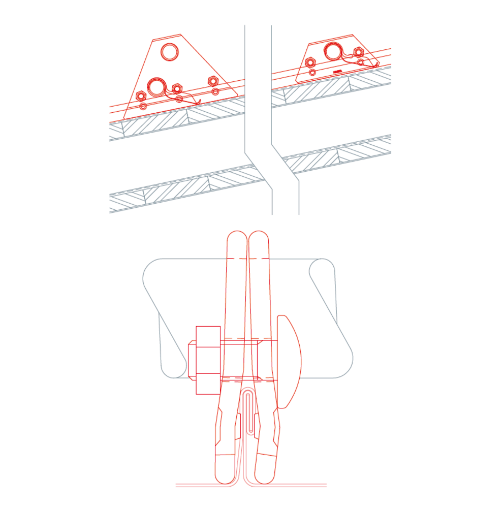 Sur les couvertures à joints debout, la protection contre la neige doit être réalisée à l’aide de brides de maintien avec passages de tubes et crochets pour glace. Le nombre de rangées de protection contre la neige nécessaires doit être calculé en fonction des particularités du bâtiment et du site.