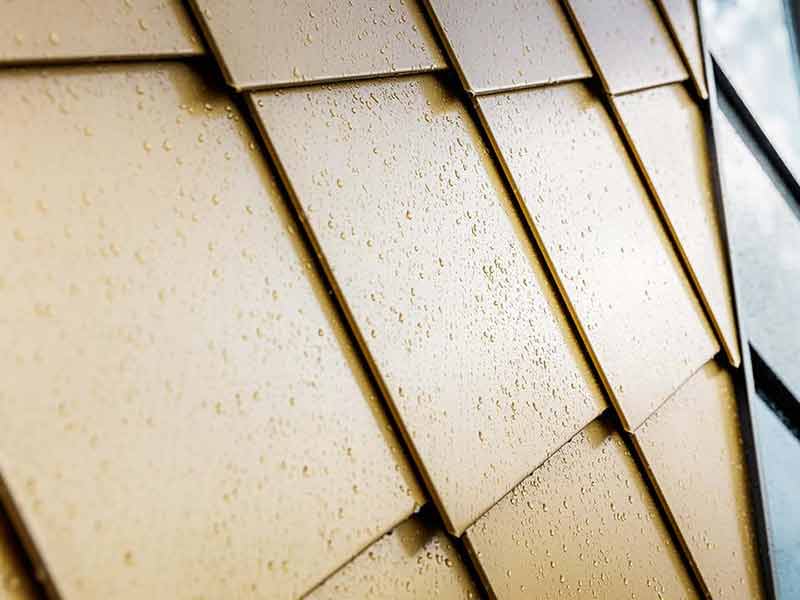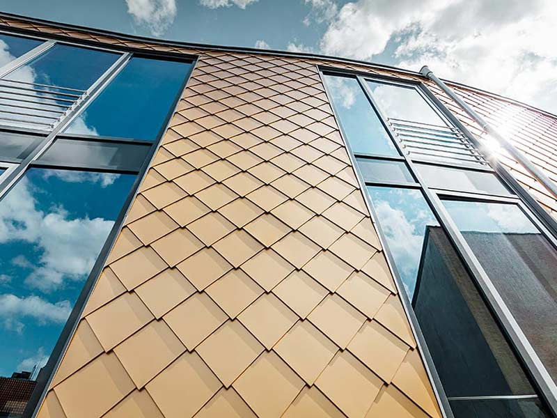 Les losanges 29 × 29 cm en aluminium couleur or de PREFA qui habillent la façade aux formes arrondies et la toiture aux multiples détails réalisée en Falzonal de PREFA se marient parfaitement avec la brique rouge traditionnelle, formant un ensemble à la fois original et esthétique.