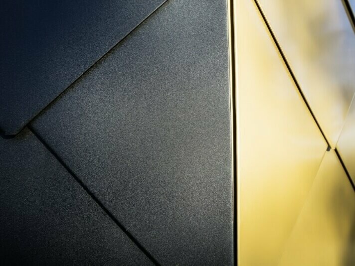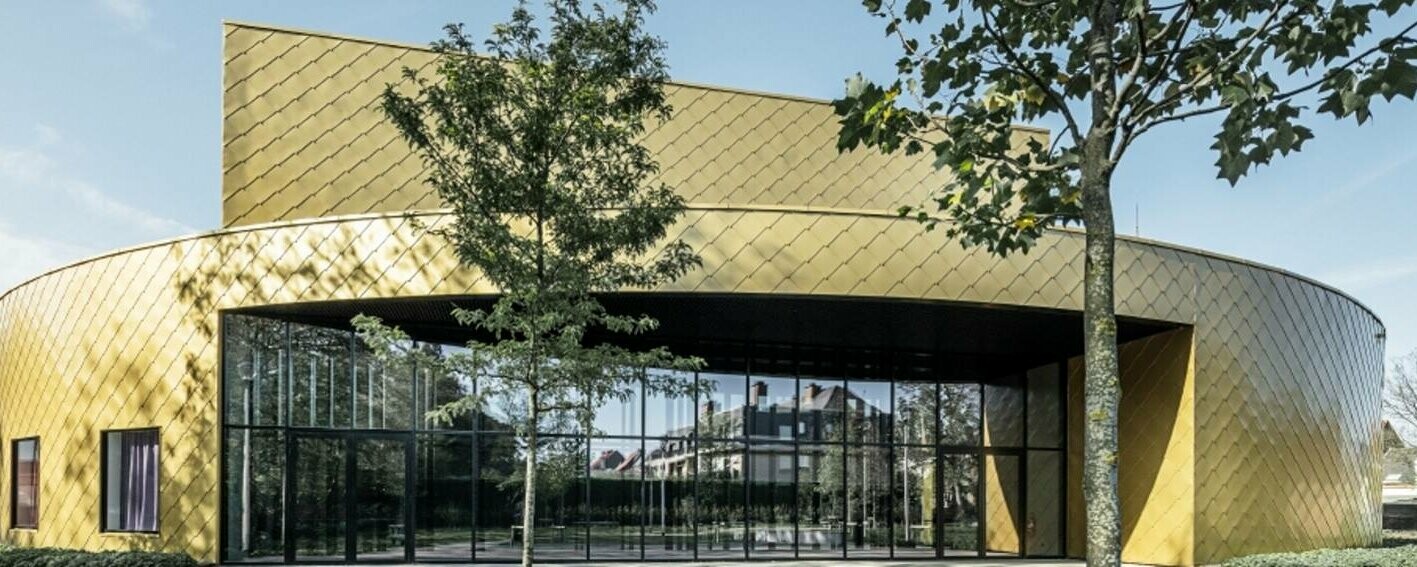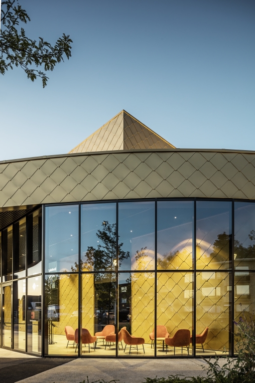 Au Polyvalente Cultureel Centrum de Kapellen (Belgique), le losange a la part belle : ce motif est repris à la fois sur la façade extérieure et sur une partie des murs intérieurs dont les surfaces sont habillées de losanges grand format 44 × 44 de PREFA, couleur mayagold et P.10 noir. « Nous aimons jouer avec des éléments simples pour créer un design original », explique Toon Heyndrickx, un des trois associés du cabinet d’architecture met zicht op zee auquel a été confié la conception de cette construction neuve. Ce nouveau centre culturel héberge notamment une salle des fêtes, une cuisine, des locaux techniques, des espaces de stockage, des vestiaires et un bar. Il se compose par ailleurs de deux corps de bâtiment — un disque cylindrique plat et un grand cube légèrement décentré posé sur ce disque. La façade en aluminium uniforme est ici et là interrompue par des surfaces de verre et des ouvertures qui permettent d’entrer dans le bâtiment ou de voir de l’extérieur ce qui se passe à l’intérieur.