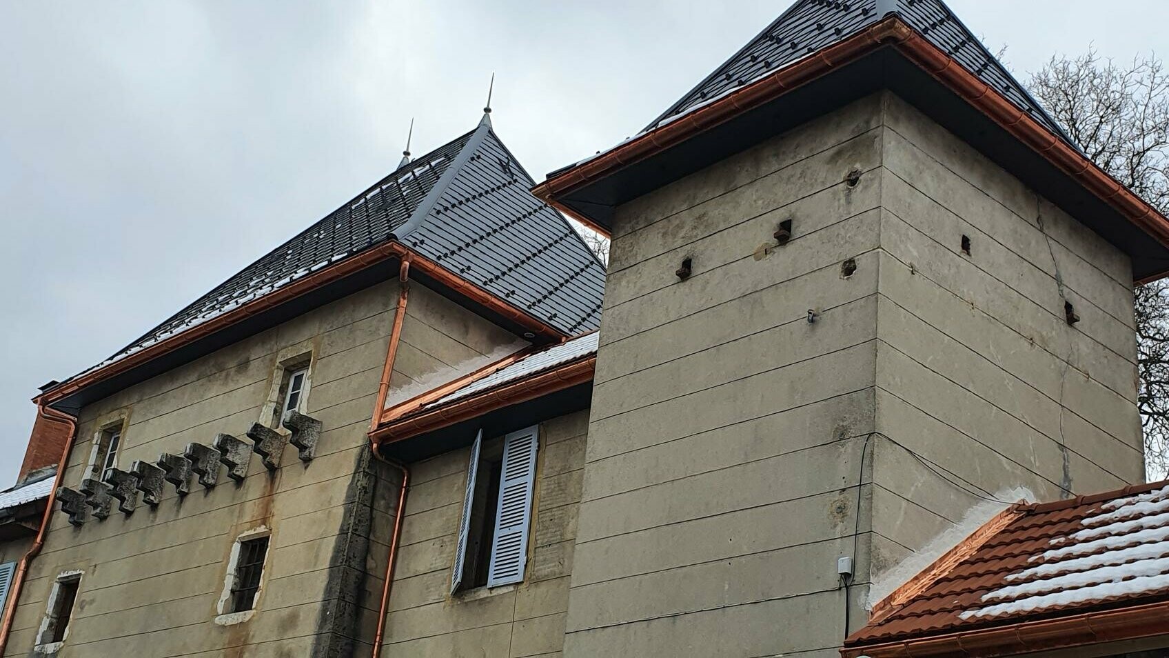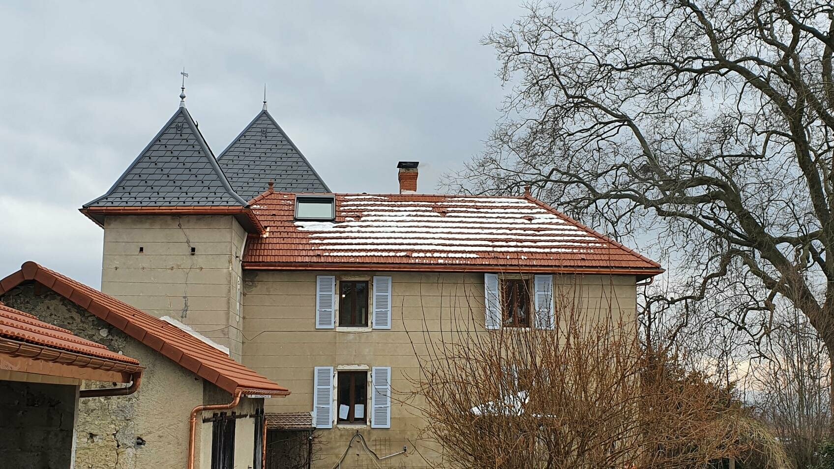 Consultée pour la rénovation du « château » par ses propriétaires, l’entreprise CARRIER CHARPENTE (située à Brénod) entreprend en 2021 la rénovation de toute la couverture de l’aile ouest, dont 2 tours à 4 pans, alors revêtues d’ardoises fibrociment (l’aile est avait déjà été rénovée auparavant en tuiles classiques).