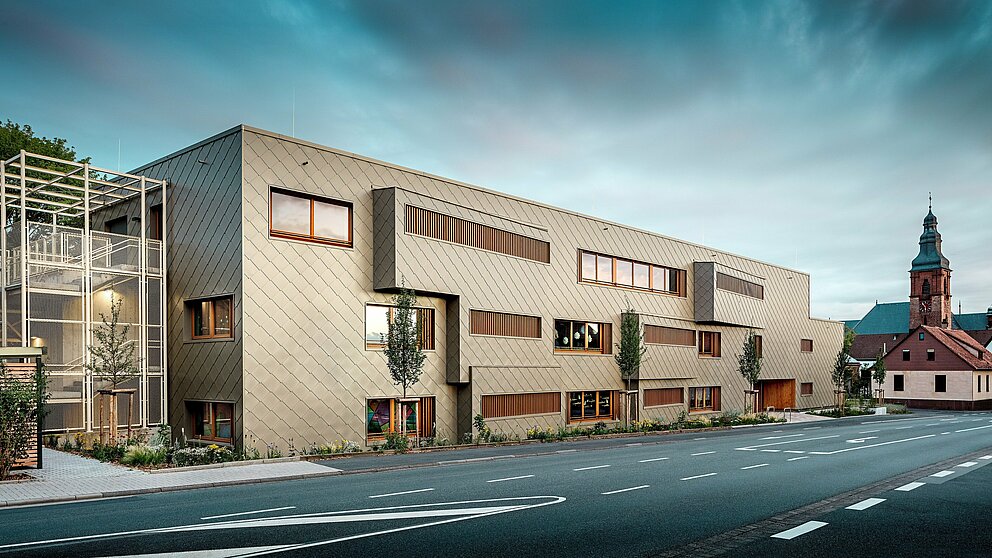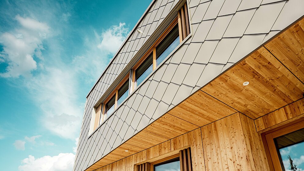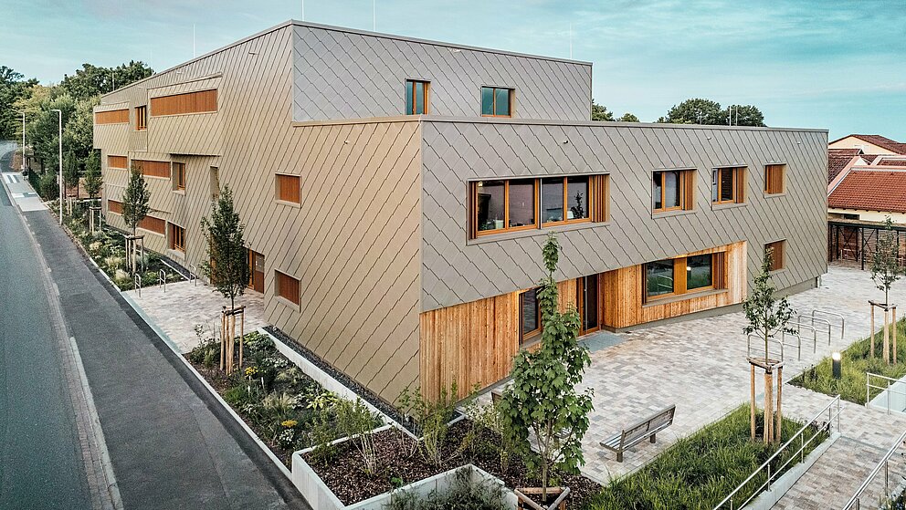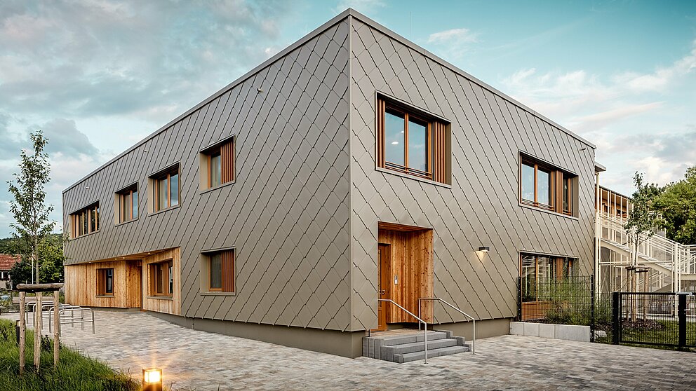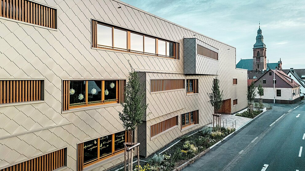 L’entreprise de zinguerie ASA Schüßler a habillé le bâtiment d’une enveloppe en aluminium couleur bronze. Cette entreprise traditionnelle franconienne a déjà mené à bien le second projet PREFARENZEN à Alzenau. Pour le bâtiment hybride, environ 3 500 grands losanges PREFA de 44 × 44 cm en finition bronze ont été posés, chacun fixé de manière invisible à l’aide de clous annelés PREFA sur le coffrage bois massif. Les nombreux angles et embrasures du bâtiment ont été traités à l’aide de profils repliés et d’équerres standard.