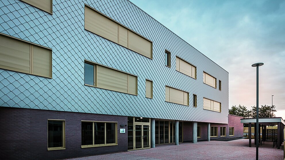 La clé du projet résidait dans la combinaison de deux matériaux : un parement en brique brunie pour le socle, et une enveloppe en aluminium argentée aux reflets métalliques pour les étages supérieurs. Cette dualité confère au bâtiment une élégance·naturelle, tout·en·affirmant sa robustesse et sa durabilité. Près de 15 000 losanges de façade 29 × 29 PREFA en argent métallisé habillent l’enveloppe extérieure du bâtiment. Cela représente plus de 1 375 m² d’aluminium conçus, façonnés et posés. Le métal aux reflets changeants crée une surface vibrante, qui capte la lumière et en reflète les différentes nuances du ciel.