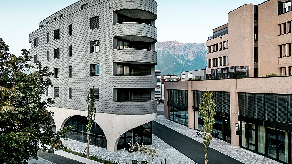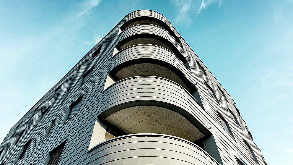 Le nouveau bâtiment allie une structure massive à une esthétique audacieuse. Cela tient d’abord à la forme triangulaire du bâtiment, dépourvue d’angles vifs. D’un autre côté, sa « peau écailleuse » en bardeaux de façade PREFA - de petite taille - en P.10 gris souris, habille la façade d’une enveloppe métallique continue et attire immédiatement le regard. Un choix judicieux, car leur format compact permet une pose même sur des rayons très serrés, idéal pour réaliser les arrondis du bâtiment. « Juste derrière notre immeuble, les maisons individuelles suisses traditionnelles sont souvent bardées », explique Thomas Keller, justifiant ainsi sa décision créative.