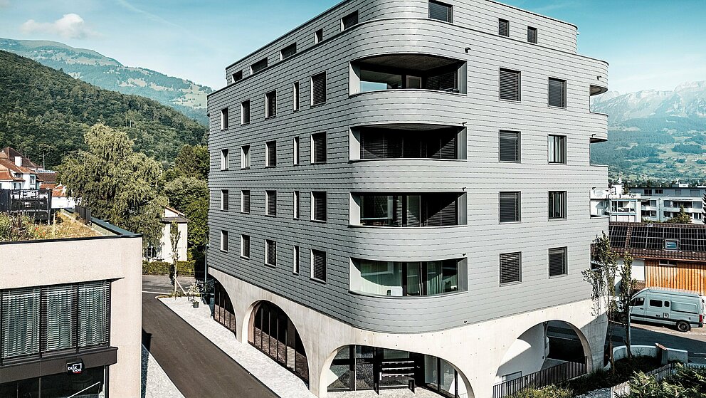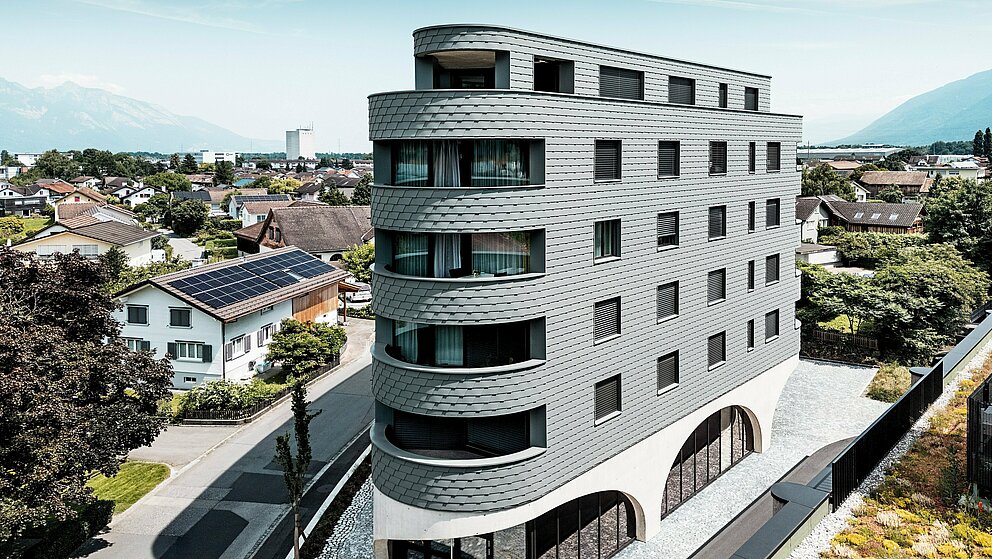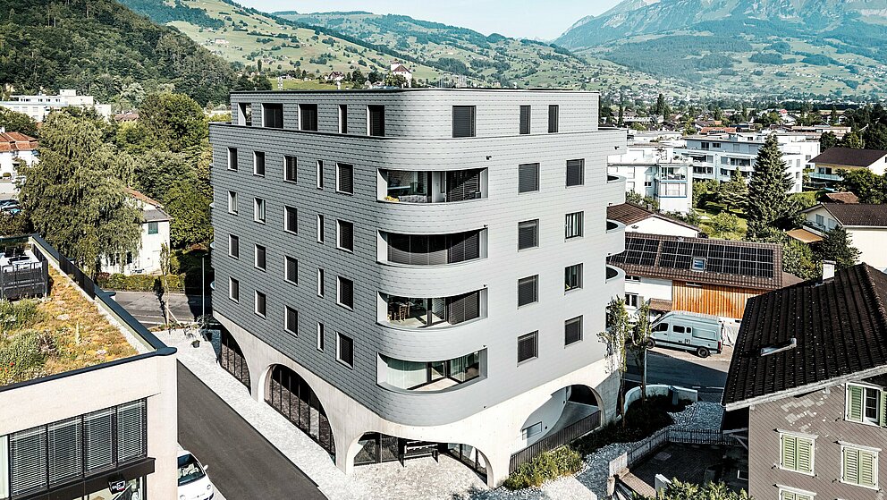 « Architecturalement séduisant, techniquement exigeant », résume Gabriel Landolt, de Künzli Davos. L’entreprise suisse, à la réputation établie, a réalisé la façade écailleuse, et collabore depuis des années avec PREFA, en raison de sa qualité reconnue : « D’un côté, le matériau est à la fois léger et résistant aux intempéries. Visuellement, il permet d’obtenir une surface homogène, intemporelle et particulièrement durable. Comme tous les produits PREFA, les bardeaux de façade utilisées à Buchs nécessitent peu d’entretien. Et l’aluminium peut être recyclé de manière durable en tant matière première secondaire. »