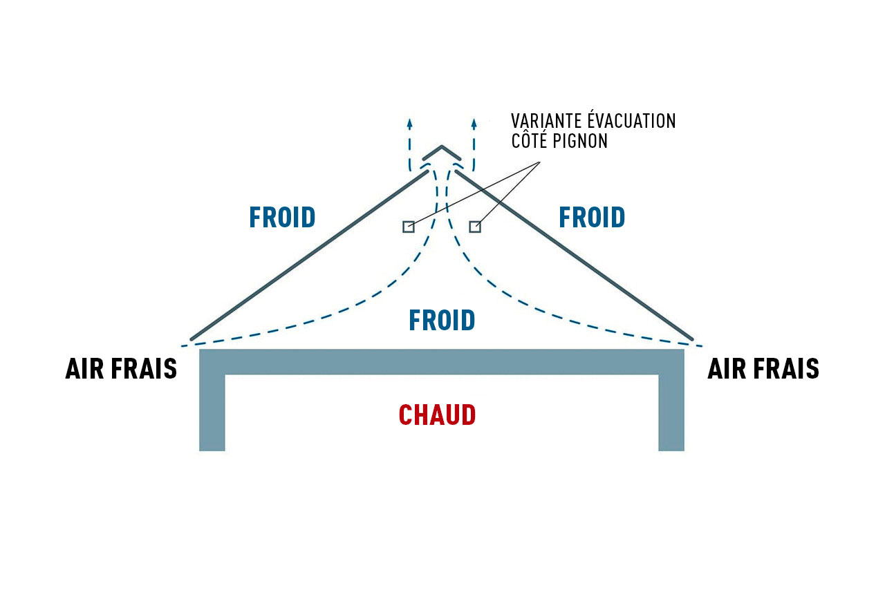 Il est recommandé de réaliser des toitures en aluminium PREFA avec sous-construction ventilée. Un espace d’aération est créé entre le revêtement de la toiture et l’isolation thermique. L’avantage est que l’humidité est évacuée. Fondamentalement, la couverture de la toiture est conçue de manière à être aérée (voir Fig. 1). Mais l’ensemble des combles peut également être aéré (voir Fig. 2).